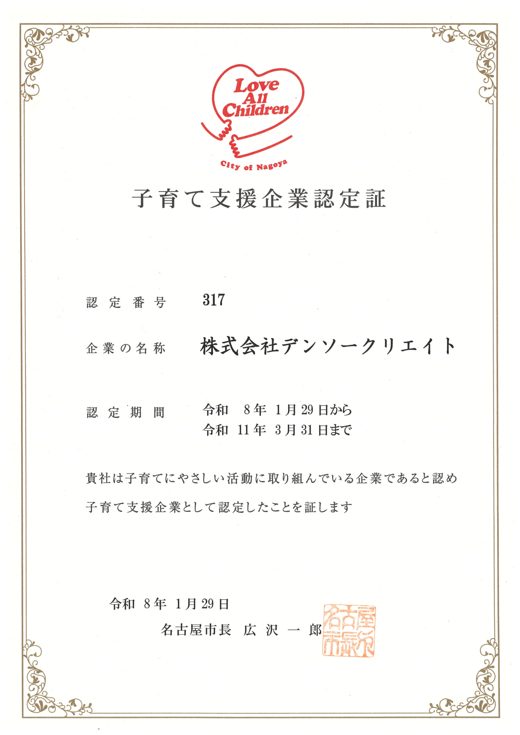 株式会社デンソークリエイト(本社:愛知県名古屋市、代表取締役社長:宮川英明)は、名古屋市が実施する「名古屋市子育て支援企業認定・表彰制度」において、本年度の「優秀賞」を受賞いたしました。 当社の子育てと仕事の両立を支える環境づくりに向けた継続的な取り組みが評価されたものであり、社員一人ひとりの人生に寄り添いながら、安心して働き続けることができる職場づくりを進めてきた当社の姿勢が認められたことを、大変光栄に受け止めています。