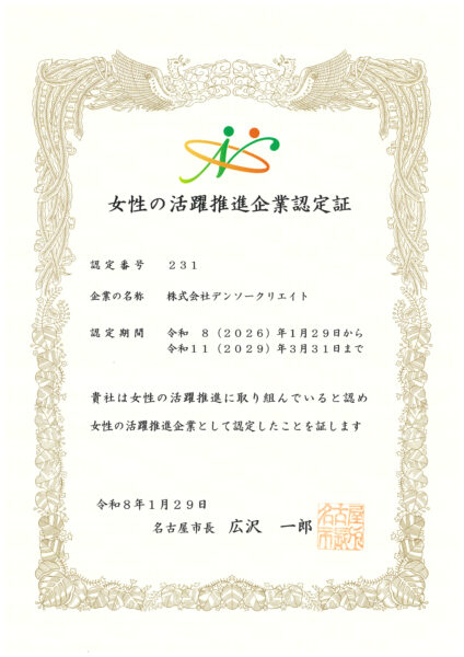 株式会社デンソークリエイト(本社:愛知県名古屋市、代表取締役社長:宮川英明)は、名古屋市が実施する「名古屋市女性の活躍推進企業認定制度」において、女性の活躍を支える環境づくりに取り組む企業として認定されました。 多様性を尊重し、性別に関係なくいきいきと活躍できる環境づくりを大切にしており、その強い思いが今回の認定へとつながりました。