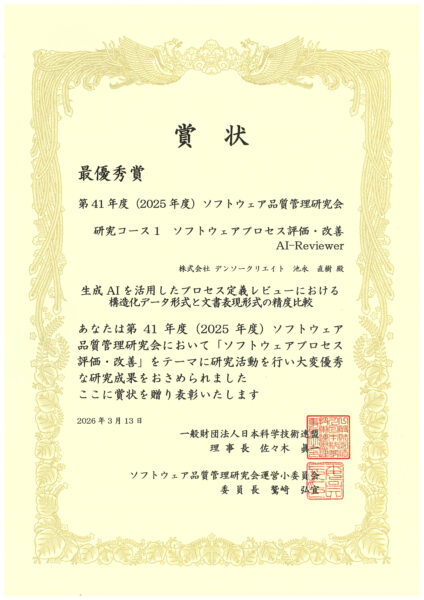 株式会社デンソークリエイト(本社:愛知県名古屋市、社長:宮川 英明)は、一般財団法人日本科学技術連盟が主催する「ソフトウェア品質管理研究会」の第41年度(2025年度)成果発表会(3月13日開催)において、当社社員の池永直樹による論文発表「生成AIを活用したプロセス定義レビューにおける構造化データ形式と文書表現形式の精度比較」が「最優秀論文賞」を受賞したことをお知らせいたします。 これにより、当社は3年連続での受賞となります。