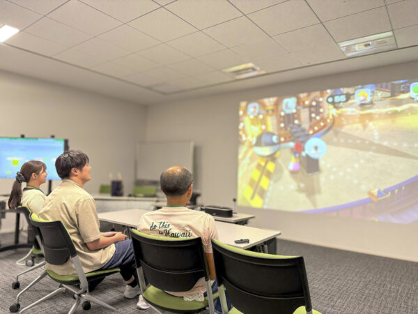 また、当日は会議室の大きなスクリーンを使って、みんなでゲームを観戦&応援。 ゲーム機のカメラ機能も活用し、操作している人の表情がスクリーンに映る仕掛けも大好評でした! キャラクターが画面外に消えると、操作者の顔も一緒に消える演出に、笑いと歓声が絶えない時間となりました。